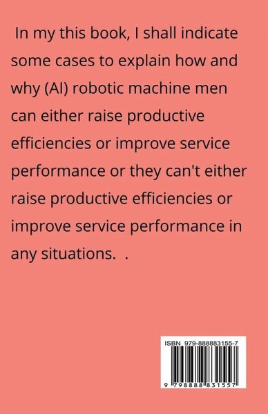 Nowadays, artificial intelligent robotic technology which is one kind of popular tool to help workers to work in factories or offices or serve clients in restaurants or shopping centers. It brings this question: Can artificial intelligent robotic machine men assist workers to raise productive efficiencies or improve service performance? ? All workers are replaced by artificial intelligent robotic machine or some workers are replaced by artificial intelligent robotic machine which can raise more productive efficiencies or improve better service performace ? In my this book, I shall indicate some cases to explain how and why (AI) robotic machine men can either raise productive efficiencies or improve service performance or they can't either raise productive efficiencies or improve service performance in any situations. Managers or employees can evaluate whether how to apply (AI) robotic machine men to assist them to work in their workplaces in order to achieve the most beneficial advantages to their organization's different departments' raising productivity and efficiency and service performance improvement aims.