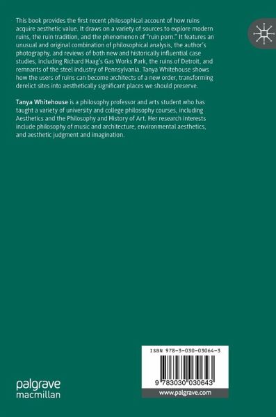 This book provides the first recent philosophical account of how ruins acquire aesthetic value. It draws on a variety of sources to explore modern ruins, the ruin tradition, and the phenomenon of "ruin porn." It features an unusual and original combination of philosophical analysis, the author's photography, and reviews of both new and historically influential case studies, including Richard Haag's Gas Works Park, the ruins of Detroit, and remnants of the steel industry of Pennsylvania. Tanya Whitehouse shows how the users of ruins can become architects of a new order, transforming derelict sites into aesthetically significant places we should preserve.