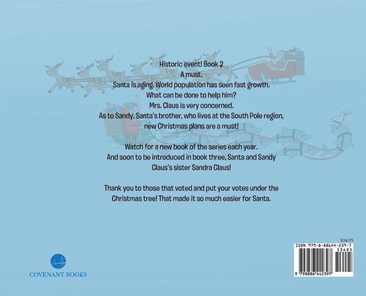 Historic event! Book 2A must.Santa is aging. World population has seen fast growth.What can be done to help him?Mrs. Claus is very concerned.As to Sandy, Santa's brother, who lives at the South Pole region, new Christmas plans are a must!Watch for a new book of the series each year.And soon to be introduced in book three, Santa and Sandy Claus's sister Sandra Claus!Thank you to those that voted and put your votes under the Christmas tree! That made it so much easier for Santa.