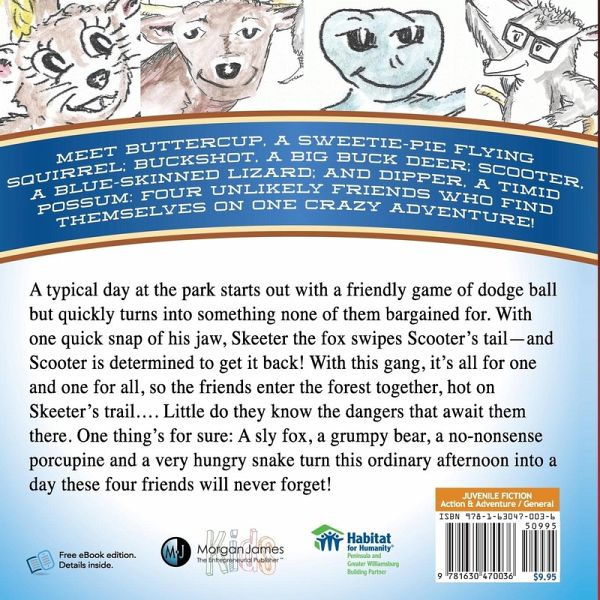 How Scooter Gets His Tail Back teaches children the importance of being a good listener and the dangers of bullying by introducing children to four personified animal creatures who have to make decisions that will affect not only themselves, but their friends as well. Buttercup, a sweetie pie flying squirrel, Buckshot, a big buck deer, Scooter, a blue skinned lizard and a Dipper, a timid possum, find one bad decision can turn a friendly game of dodge ball in the forest park into a day full of dangers and tough lessons. Children engage in an exciting adventure while learning life lessons throughout How Scotter Gets His Tail Back.