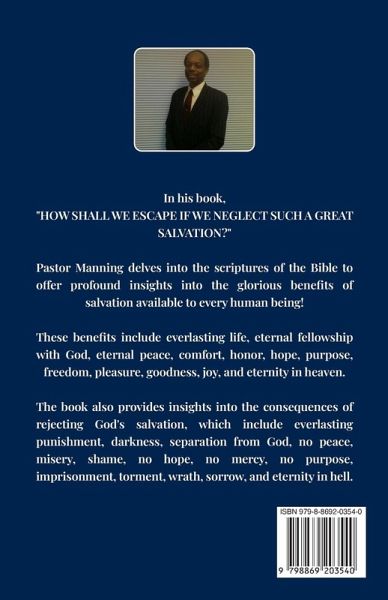 In his book, "HOW SHALL WE ESCAPE IF WE NEGLECT SUCH A GREAT SALVATION?" Pastor Manning delves into the scriptures of the Bible to offer profound insights into the glorious benefits of salvation available to every human being! These benefits include everlasting life, eternal fellowship with God, eternal peace, comfort, honor, hope, purpose, freedom, pleasure, goodness, joy, and eternity in heaven. The book also provides insights into the consequences of rejecting God's salvation, which include everlasting punishment, darkness, separation from God, no peace, misery, shame, no hope, no mercy, no purpose, imprisonment, torment, wrath, sorrow, and eternity in hell.