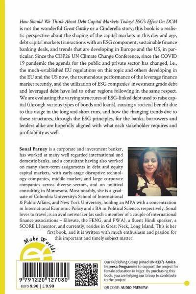 How Should We Think About Debt Capital Markets Today? ESG's Effect On DCM is not the wonderful Great Gatsby or a Cinderella story; this book is a realistic perspective about the shaping of the capital markets in this day and age, debt capital markets transactions with an ESG component, sustainable finance banking deals, and trends that are developing in Europe and the US, in particular. Since the COP26 UN Climate Change Conference, since the COVID 19 pandemic the agenda for the public and private sector has changed, i.e., the much-established EU regulations on this topic and others developing in the EU and the US now, the tremendous performance of the leverage finance market recently, and the utilization of ESG companies' investment grade debt and leveraged debt have led to other regions following in the same respect. We are evaluating the varying structures of ESG-linked debt used to raise capital (through various types of bonds and loans), causing a societal benefit due to this usage in the long and short runs, and how the changing trends due to these structures, through the ESG principles, for the banks, borrowers and lenders alike are hopefully aligned with what each stakeholder requires and profitability as well. Sonal Patney is a corporate and investment banker, has worked at many well regarded international and domestic banks, and a consultant having also worked on many short-term assignments in debt and equity capital markets, with early-stage disruptive technology companies, middle-market, and large corporate companies across diverse sectors, and on political consulting in Minnesota. Most notably, she is a graduate of Columbia University's School of International & Public Affairs, and New York University, holding an MPA with a concentration in International Economic Policy and a BA in Political Science, respectively. Sonal loves to travel, is an avid networker (as such a member of a couple of international finance associations - Ellevate, the FENG, and FWA), a fluent Hindi speaker, a SCORE LI mentor, and currently, resides in Great Neck, Long Island. This is her first book, and it is written with much enthusiasm and passion for this important and timely subject matter.