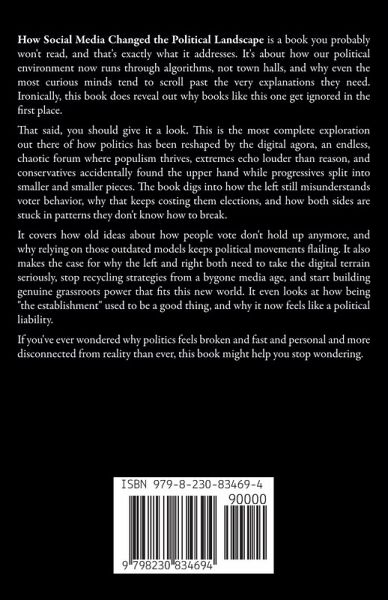 How Social Media Changed the Political Landscape is a book you probably won't read, and that's exactly what it addresses. It's about how our political environment now runs through algorithms, not town halls, and why even the most curious minds tend to scroll past the very explanations they need. Ironically, this book does reveal out why books like this one get ignored in the first place. That said, you should give it a look. This is the most complete exploration out there of how politics has been reshaped by the digital agora, an endless, chaotic forum where populism thrives, extremes echo louder than reason, and conservatives accidentally found the upper hand while progressives split into smaller and smaller pieces. The book digs into how the left still misunderstands voter behavior, why that keeps costing them elections, and how both sides are stuck in patterns they don't know how to break. It covers how old ideas about how people vote don't hold up anymore, and why relying on those outdated models keeps political movements flailing. It also makes the case for why the left and right both need to take the digital terrain seriously, stop recycling strategies from a bygone media age, and start building genuine grassroots power that fits this new world. It even looks at how being "the establishment" used to be a good thing, and why it now feels like a political liability. If you've ever wondered why politics feels broken and fast and personal and more disconnected from reality than ever, this book might help you stop wondering.