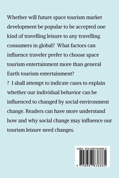 How social change influences human behavioral change ? Why human behavior may be influenced by social change? Our individual behavior whether can be influenced to bring negative or positive attitude by social change? I shall attempt to indicate cases to explain whether our individual behavior can be influenced to changed by social environment change. Readers can have more understand how and why social change may influence our behavior in possible. Behavioral economy is one useful and fun social subject. Behavioral economists ususally research how and why human behaviors may influence economy growth or recession, or how and why economy environment changing factor may influence human behavior changes. In this book, I shall follow travel psychologists and space tourism entertainment businessmen support view points to give my opinions to attempt to answer above questions. My readers will learn how to apply new space travel strategic knowledge and (AI) or traditonal tourism marketing predict methods to solve and predict future space tourism leisure as well as cruise and destination consumer behavior more accurately.