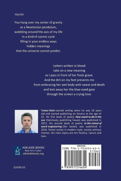 Tomer Klein started writing when he was 18 years old and started publishing on forums at the age of 22. His first book of poetry How sweet to die in the sea (Steimazky publishing house) was published in 2013. His second book of poetry In the school of word engineering (Niv books) was published in 2018. Tomer writes in modern style, mostly without rhymes. His main topics are Ars Poetica, nature and love.