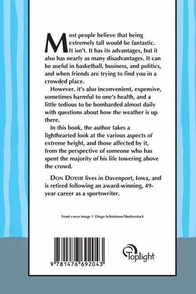 Most people believe that being extremely tall would be fantastic. It isn't. It has its advantages, but it also has nearly as many disadvantages. It can be useful in basketball, business, and politics, and when friends are trying to find you in a crowded place. However. it's also inconvenient, expensive, sometimes harmful to one's health, and a little tedious to be bombarded almost daily with questions about how the weather is up there. In this book, the author takes a lighthearted look at the various aspects of extreme height, and those affected by it, from the perspective of someone who has spent the majority of his life towering above the crowd.