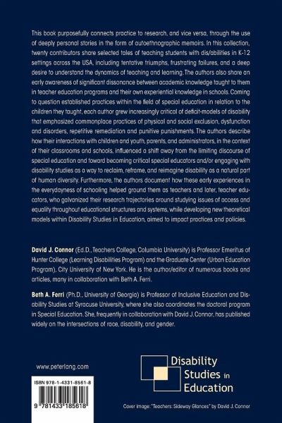 David J. Connor/Beth A. Ferri: Introduction: Learning from Teachers' Lives - Jan W. Valle: How I Got Here from There: The Road to Disability Studies in Education - Deborah J. Gallagher: To My Students, with Gratitude: A Retrospective Journey of Teaching [Special Education] - Beth A. Ferri: Snapshots of School - Scot Danforth: From Harmful to Helpful - Classroom Spaces and School Structures - Kathleen M. Collins: "Why Is Lisa's classroom in the basement?" Reflections on Noticing and Disrupting Exclusion - Federico R. Waitoller: Fictionalized Memories: The Making of a Research Identity in Four Seasons - Erin McCloskey: Paintings on Clear Plastic that Hang from the Ceiling - Brent Elder: The Promises We Keep - Pedagogy and Practices - Catherine Kramarczuk Voulgarides: Humanizing "Special" Educational Practices - Christine Ashby: "Off to Another Glorious Day of Educational Opportunity": But for Whom? - Susan Baglieri: How I Learned to Be a Teacher in Room 137 - Julia White: Giving Points, Pathologizing Race, and Reading Harry Potter - Families - Mildred Boveda: Surprising Home Visits - Maria Cioè- Peña: Teaching as Oppression; Teaching as Liberation - Srikala Naraian: Searching for Competence: (T)reading the Spaces between Ways of Knowing - Linda Ware: No Bat Required - Both Sides of the Desk - April Coughlin: Education Is Power: But Only if You Can Get into the Building - David I. Hernández- Saca: Recovering the Spirit - Saili S. Kulkarni: Journey as a Special Education Teacher of Color with Dis/abilities - Suzanne Stolz: My Disabled Teacher Presence - Beth A. Ferri/David J. Connor: Conclusion: Bridging Theory and Practice through Story - Index.