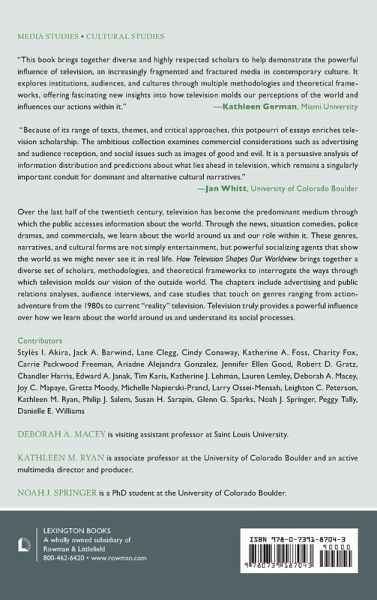1. Introduction Deborah A. Macey, Kathleen M. Ryan and Noah J. Springer Section I: Not Necessarily the News 2. A Bigger Screen for a Narrower View Jack A. Barwind, Philip J. Salem, and Robert D. Gratz 3. Measuring the Messenger: Analyzing Bias in Presidential Election Return Coverage Kahtleen M. Ryan, Lane Clegg, and Joy C. Mapaye 4. Television, Islam, and the Invisible: Narratives on Terrorism and Immigration Tim Karis Section II: Boy (and Girl) Meets World 5. "Your Dreams Were Your Ticket Out:" How Mass Media's Teachers Constructed One Educator's Identity Edward A. Janak 6. Defying Gravity: Fox's Glee Provides a Forum for Queer Teen Representation Katherine J. Lehman 7. Friendship and the Single Girl: What We Learned about Feminism and Friendship from Sitcom Women in the 1960s and 1970s Cindy Conaway and Peggy Tally Section III: America's Most Wanted 8. Epic Failures: Media Framing and the Ethics of Scapegoating in Baseball Chandler Harris and Lauren Lemley 9. Eyewitnesses to TV Versions of Reality: The Relationship between Exposure to TV Crime Dramas and Perceptions of the Criminal Justice System Susan H. Sarapin and Glenn G. Sparks 10. Paramilitary Patriots of the Cold War: Women, Weapons, and Private Warriors in The A-Team and Airwolf Charity Fox Section IV: The More You Know 11. Lisa and Phoebe, Lone Vegetarian Icons: At Odds with Television's Carnonormativity Carrie Packwood Freeman 12. Television and the Environment: More Screen-Less Green Jennifer Ellen Good 13. From Welby to McDreamy: What TV Teaches Us About Doctors, Patients, and the Health Care System Katherine A. Foss Section V: The Voice 14. Made Impossible by Viewers Like You: The Politics and Poetics of Native American Voices in US Public Television Leighton C. Peterson 15. "Real" Black, "Real" Money: African American Audiences on The Real Housewives of Atlanta Gretta Moody 16. He Who has the Gold Makes the Rules: Tyler Perry Presents "The Tyler Perry Way" Danielle E. Williams 17. Viewing 90210 from 12203: Affluent TV Teens Influence a Cohort of Middle Class Women Michelle Napierski-Prancl Section VI: Futurama 18. The Construction of Taste: Television and American Home Décor Stylés I. Akira and Larry Ossei-Mensah 19. Bordertown: Manufacturing Mexicanness in Reality Television Ariadne Alejandra Gonzalez 20. Cyborgs in the Newsroom: Databases, Cynicism and Political Irony in The Daily Show Noah J. Springer