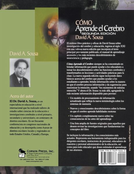 Segunda Edicion The powerful best-seller on brain research and education is available in a Spanish Language Edition. Cómo Aprende el Cerebro siempre se ha concentrado en brindar información que puede ayudar a los educadores a tomar los descubrimientos sobre las funciones cerebrales y transformarlos en lecciones y actividades prácticas para la clase. La nueva segunda edición sigue incluyendo datos básicos acerca del cerebro que pueden ayudar a los estudiantes a aprender, brinda información sobre la manera en que el cerebro procesa información y da sugerencias para maximizar la retención, usando "los momentos de mínima retención." siempre se ha concentrado en brindar información que puede ayudar a los educadores a tomar los descubrimientos sobre las funciones cerebrales y transformarlos en lecciones y actividades prácticas para la clase. La nueva segunda edición sigue incluyendo datos básicos acerca del cerebro que pueden ayudar a los estudiantes a aprender, brinda información sobre la manera en que el cerebro procesa información y da sugerencias para maximizar la retención, usando "los momentos de mínima retención."