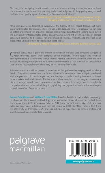 This book presents a solution to this problem by keeping track of those details. Schnidman and MacMillan demonstrate how the latest advances in automated text analysis, combined with the precision of domain expertise, are the keys to understanding how central banks move markets with their words. The authors outline a method to not only examine every piece of every central bank communication, but to do it in a way that is completely comprehensive and unbiased while quickly yielding hard, quantitative data that can be put to work in modern financial models.