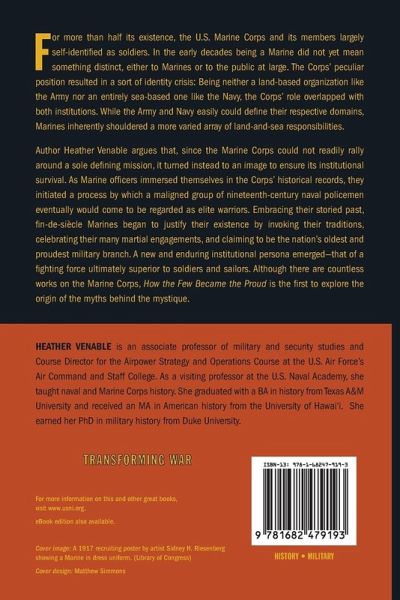 For more than half its existence, the U.S. Marine Corps and its members largely self-identified as soldiers. In the early decades, being a Marine did not yet mean something distinct, either to Marines or to the public at large. The Corps’ peculiar position resulted in a sort of identity crisis: Being neither a land-based organization like the Army nor an entirely sea-based one like the Navy, the Corps’ role overlapped with both institutions. While the Army and Navy easily could define their respective domains, Marines inherently shouldered a more varied array of land-and-sea responsibilities. Author Heather Venable argues that, since the Marine Corps could not readily rally around a sole defining mission, it turned instead to an image to ensure its institutional survival. As Marine officers immersed themselves in the Corps’ historical records, they initiated a process by which a maligned group of nineteenth-century naval policemen eventually would come to be regarded as elite warriors. Embracing their storied past, fin-de-siècle Marines began to justify their existence by invoking their traditions, celebrating their many martial engagements, and claiming to be the nation’s oldest and proudest military branch. A new and enduring institutional persona emerged—that of a fighting force ultimately superior to soldiers and sailors. Although there are countless works on the Marine Corps, How the Few Became the Proud is the first to explore the origin of the myths behind the mystique.