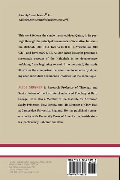 This work follows the single tractate, Moed Qatan, in its passage through the principal documents of formative Judaism_the Mishnah (200 C.E.), Tosefta (300 C.E.), Yerushalmi (400 C.E.), and Bavli (600 C.E.). In acute detail, the study explores similarities between the documents by showing each individual document's treatment of the same topic.