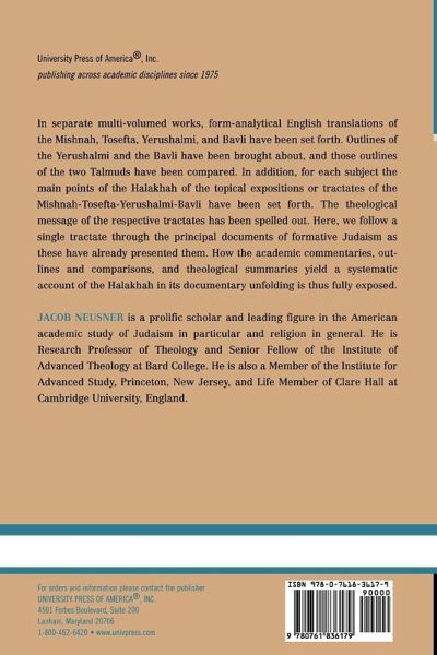 In separate multi-volumed works, form-analytical English translations of the Mishnah, Tosefta, Yerushalmi, and Bavli have been set forth. Outlines of the Yerushalmi and the Bavli have been brought about, and those outlines of the two Talmuds have been compared. In addition, for each subject the main points of the Halakhah of the topical expositions or tractates of the Mishnah-Tosefta-Yerushalmi-Bavli have been set forth. The theological message of the respective tractates has been spelled out. Here, we follow a single tractate through the principal documents of formative Judaism as these have already presented them. How the academic commentaries, outlines and comparisons, and theological summaries yield a systematic account of the Halakhah in its documentary unfolding is thus fully exposed.