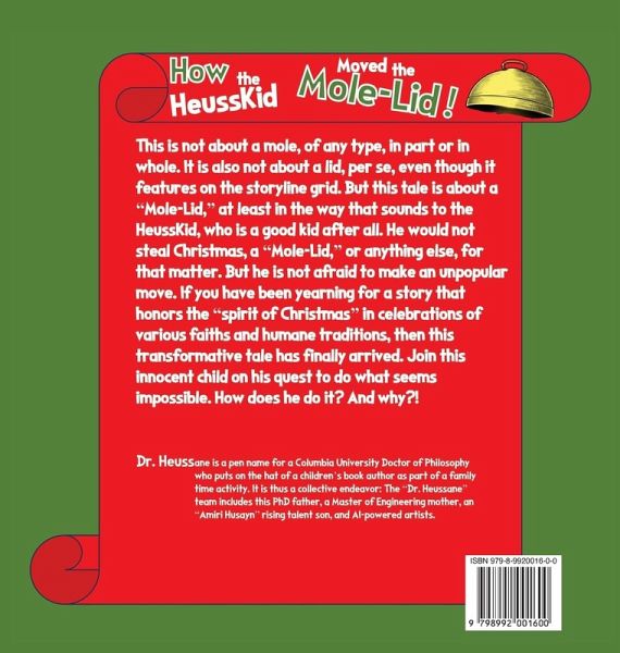 This is not about a mole, of any type, in part or in whole. It is also not about a lid, per se, even though it features on the storyline grid. But this tale is about a "Mole-Lid," at least in the way that sounds to the HeussKid, who is a good kid after all. He would not steal Christmas, a "Mole-Lid," or anything else, for that matter. But he is not afraid to make an unpopular move. If you have been yearning for a story that honors the "spirit of Christmas" in celebrations of various faiths and humane traditions, then this transformative tale has finally arrived. Join this innocent child on his quest to do what seems impossible. How does he do it? And why?!