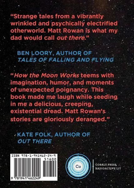 In How the Moon Works, globally underappreciated author Matt Rowan, strives for literary greatness by teaching us all how exactly the moon works and fails heroically. He blames "the establishment," claiming that this book is his way to "make you all pay," but really he just hopes you buy multiple copies so he can get that new Schwinn for his kid. These stories are, for the most part, manifestations of Rowan's darkest fears. A product's best feature is its ability to terrify. Children are subjected to cruel rites of passage in restaurants suspiciously resembling ShowBiz Pizza. A man believes his only chance at salvation is through the reluctant acquaintance of an elder. A tourist trap capitalizes on the perfect simulacrum of the world's historical idols. Teenagers are reared to hate and kill an unknowable enemy at the urging of muppets. Coworkers willingly give up their humanity to act as unfeeling robots. Does all that intrigue you enough to want to read How the Moon Works? Matt Rowan hopes so, though he is also satisfied knowing this book has served as an elaborate medium for working out some stuff.
