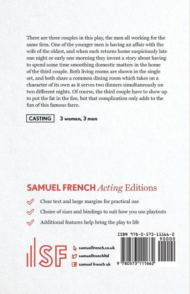There are three couples in this play, the men all working for the same firm. One of the younger men is having an affair with the wife of the oldest, and when each returns home suspiciously late one night or early one morning they invent a story about having to spend some time smoothing domestic matters in the home of the third couple. Both living rooms are shown in the single set, and both share a common dining room which takes on a character of its own as it serves two dinners simultaneously on two different nights. Of course, the third couple have to show up to put the fat in the fire, but that complication only adds to the fun of this famous farce.