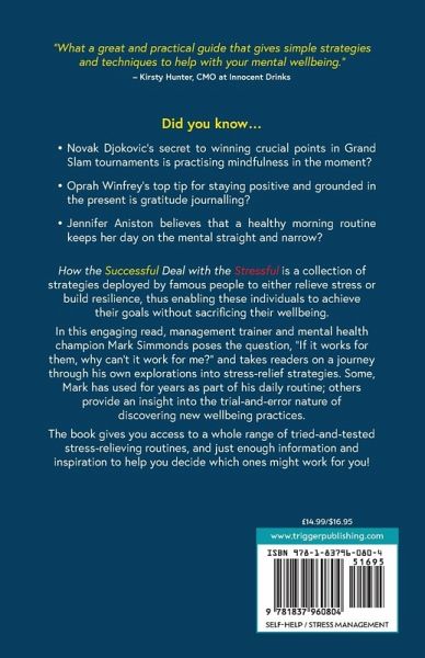 Tapping into the lived experience of 25 successful individuals, author Mark Simmonds explores the tried-and-tested psychological principles that underpin the strategies they use to combat stress, and offers practical advice that will help readers achieve their goals without breaking down or burning out. Did you know… * Novak Djokovic’s secret to winning crucial points in Grand Slam tennis tournaments is practising mindfulness in the moment? * Oprah Winfrey’s top tip for staying positive and grounded in the present is gratitude journalling? * Winston Churchill was a passionate advocate of the afternoon nap, even as bombs were falling all around him? * Jennifer Aniston believes in the importance of a healthy morning routine to keep her day on the mental straight and narrow? How the Successful Deal with the Stressful is a collection of strategies deployed by famous people from the fields of business, politics, music, entertainment, sport and adventure. These strategies either relieve stress or help build resilience, and have enabled these individuals to achieve their goals without sacrificing their wellbeing. In this engaging read, management trainer and mental health champion Mark Simmonds poses the question, “If it works for them, why can’t it work for me?” and takes readers on a journey through his own explorations into stress-relief strategies. Some, Mark has used for years as part of his daily routine; others provide an insight into the trial-and-error nature of discovering new wellbeing practices. The book gives you access to a whole range of tried-and-tested stress-relieving routines, and just enough information and inspiration to help you decide which ones might just work for you!