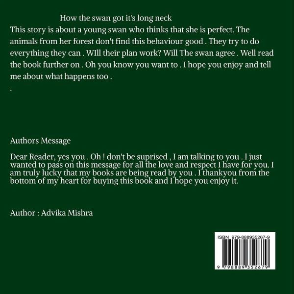 This story is about a little swan who is too arrogant to ask for help but she really need's the help . Her greatest problem is that her neck is too short . How does she get her long neck, do you want to know . Well let's dive deep into to the book to find out.