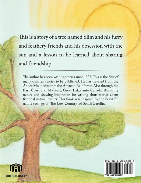 This is a story of a tree named Slim and his furry and feathery friends and his obsession with the sun and a lesson to be learned about sharing and friendship.