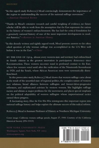 Uncovers how women in the West fought for the right to vote By the end of 1914, almost every Western state and territory had enfranchised its female citizens in the greatest innovation in participatory democracy since Reconstruction. These Western successes stand in profound contrast to the East, where few women voted until after the ratification of the Nineteenth Amendment in 1920, and the South, where African-American men were systematically disenfranchised. How did the frontier West leap ahead of the rest of the nation in the enfranchisement of the majority of its citizens? In this provocative new study, Rebecca J. Mead shows that Western suffrage came about as the result of the unsettled state of regional politics, the complex nature of Western race relations, broad alliances between suffragists and farmer-labor-progressive reformers, and sophisticated activism by Western women. She highlights suffrage racism and elitism as major problems for the movement, and places special emphasis on the political adaptability of Western suffragists whose improvisational tactics earned them progress. A fascinating story, previously ignored, How the Vote Was Won reintegrates this important region into national suffrage history and helps explain the ultimate success of this radical reform.