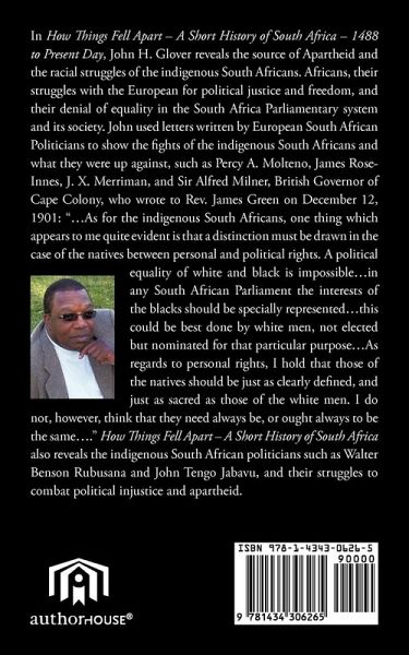 In How Things Fell Apart - A Short History of South Africa - 1488 to Present Day, John H. Glover reveals the source of Apartheid and the racial struggles of the indigenous South Africans. Africans, their struggles with the European for political justice and freedom, and their denial of equality in the South Africa Parliamentary system and its society. John used letters written by European South African Politicians to show the fights of the indigenous South Africans and what they were up against, such as Percy A. Molteno, James Rose-Innes, J. X. Merriman, and Sir Alfred Milner, British Governor of Cape Colony, who wrote to Rev. James Green on December 12, 1901: ".As for the indigenous South Africans, one thing which appears to me quite evident is that a distinction must be drawn in the case of the natives between personal and political rights. A political equality of white and black is impossible.in any South African Parliament the interests of the blacks should be specially represented.this could be best done by white men, not elected but nominated for that particular purpose.As regards to personal rights, I hold that those of the natives should be just as clearly defined, and just as sacred as those of the white men. I do not, however, think that they need always be, or ought always to be the same.." How Things Fell Apart - A Short History of South Africa also reveals the indigenous South African politicians such as Walter Benson Rubusana and John Tengo Jabavu, and their struggles to combat political injustice and apartheid.