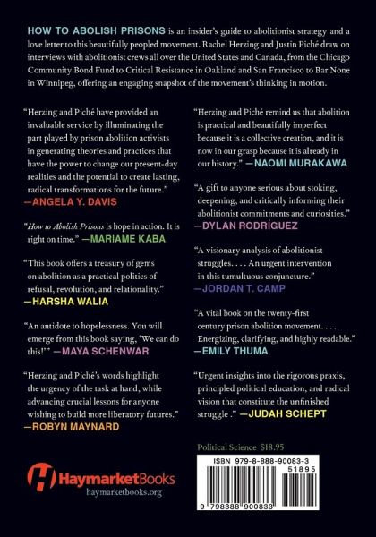 An incisive guide to abolitionist strategy, and a love letter to the movement that made this moment possible. Critics of abolition sometimes castigate the movement for its utopianism, but in How to Abolish Prisons, long-time organizers Rachel Herzing and Justin Piché reveal a movement that has made the struggle for abolition as real as the institutions they are fighting against. Drawing on extensive interviews with abolitionist crews all over North America, Herzing and Piché provide a collective reconstruction of what the grassroots movement to abolish prisons actually is, what initiatives it has launched, how it organizes itself, and how its protagonists build the day-to-day practice of politics. Readers sit in on the Winnipeg rideshares of Bar None and the meetings of the Chicago Community Bail Fund as they assess the utility of politicized mutual aid. They follow the campaigns and coalitions of Critical Resistance in Oakland and San Francisco and Survived and Punished in New York City, and learn about the prisoner correspondence projects that keep activists behind bars and outside them in constant coordination. Abolitionist campaigns are constructing on-the-ground initiatives across North America to deconstruct carceral society and build resistant communities.Through the words, deeds, and personalities of this beautifully peopled movement, How to Abolish Prisons emerges as a stunning snapshot of a movement’s thinking in motion.