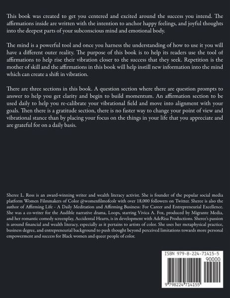 This book was created to get you centered and excited around the success you intend. The affirmations inside are written with the intention to anchor happy feelings, and joyful thoughts into the deepest parts of your subconscious mind and emotional body. The mind is a powerful tool and once you harness the understanding of how to use it you will have a different outer reality. The purpose of this book is to help its readers use the tool of affirmations to help rise their vibration closer to the success that they seek. Repetition is the mother of skill and the affirmations in this book will help instill new information into the mind which can create a shift in vibration. There are three sections in this book. A question section where there are question prompts to answer to help you get clarity and begin to build momentum. An affirmation section to be used daily to help you re-calibrate your vibrational field and move into alignment with your goals. Then there is a gratitude section, there is no faster way to change your point of view and vibrational stance than by placing your focus on the things in your life that you appreciate and are grateful for on a daily basis.