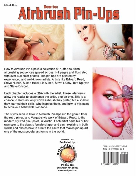 How to Airbrush Pin-Ups is a collection of 7, start-to-finish airbrushing sequences spread across 144 pages and illustrated with over 600 color photos. The pin-ups are painted by experienced and well-known artists. Artists like Edward Reed, Steve Nunez, Susan Heidi, Liz Austin, Steve Leahy, Tom Nguyen and Steve Driscoll. Each chapter includes a Q&A with the artist. These interviews allow the reader to experience the artist, one-on-one. This is a chance to learn not only which airbrush they prefer, but also how they learned their skills, who inspires them, and how to mix paint to achieve a believable skin tone. The styles seen in How to Airbrush Pin-Ups run the gamut from the retro pin-up and Vargas-style work of Edward Reed, to the modern stylized pin-ups of Liz Austin. Each artist adds his or her own spin to the classic female shape, and each explains in both words and photos how to create the allure that makes pin-up art one of the most popular art forms in the world.