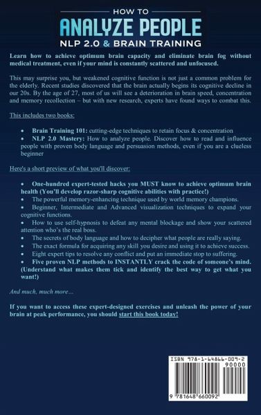 Learn how to achieve optimum brain capacity and eliminate brain fog without medical treatment, even if your mind is constantly scattered and unfocused. This may surprise you, but weakened cognitive function is not just a common problem for the elderly. Recent studies discovered that the brain actually begins its cognitive decline in our 20s. By the age of 27, most of us will see a deterioration in brain speed, concentration and memory recollection – but with new research, experts have found ways to combat this. This includes two books: Brain Training 101: cutting-edge techniques to retain focus & concentration NLP 2.0 Mastery: How to analyze people. Discover how to read and influence people with proven body language and persuasion methods, even if you are a clueless beginner Here's a short preview of what you'll discover: One-hundred expert-tested hacks you MUST know to achieve optimum brain health (You’ll develop razor-sharp cognitive abilities with practice!) The powerful memory-enhancing technique used by world memory champions. Beginner, Intermediate and Advanced visualization techniques to expand your cognitive functions. How to use self-hypnosis to defeat any mental blockage and show your scattered attention who’s the real boss. The secrets of body language and how to decipher what people are really saying. The exact formula for acquiring any skill you desire and using it to achieve success. Eight expert tips to resolve any conflict and put an immediate stop to suffering. Five proven NLP methods to INSTANTLY crack the code of someone’s mind. (Understand what makes them tick and identify the best way to get what you want!) And much, much more… If you want to access these expert-designed exercises and unleash the power of your brain at peak performance, you should start this book today!