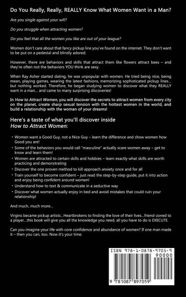 Do You Really, Really, REALLY Know What Women Want in a Man? Are you single against your will? Do you struggle when attracting women? Do you feel that all the women you like are out of your league? If you want to stop all these in your life, then keep reading... Women don't care about that fancy pickup line you've found on the internet. They don't want to be put on a pedestal and blindly adored. However, there are behaviors and skills that attract them like flowers attract bees - and they're often not the behaviors YOU think are sexy. When Ray Asher started dating, he was unpopular with women. He tried being nice, being mean, playing games, wearing the latest fashions, memorizing sophisticated pickup lines... but nothing worked. Therefore, he began studying women to discover what they REALLY want in a man... and came to many surprising discoveries! In How to Attract Women, you will discover the secrets to attract women from every city on the planet, create sharp sexual tension with the hottest women in the world, and build a relationship with the woman of your dreams! Here's a taste of what you'll discover inside How to Attract Women: * Women want a Good Guy, not a Nice Guy - learn the difference and show women how Good you are! * Some of the behaviors you would call "masculine" actually scare women away - get to know and learn them! * Women are attracted to certain skills and hobbies - learn exactly what skills are worth practicing and demonstrating * Discover the one proven method to kill approach anxiety once and for all * Train yourself to become confident - just read the step-by-step guide, put it into action and enjoy being confident around women! * Understand how to text, talk and communicate in a seductive way * Discover what women actually enjoy in bed and avoid mistakes that could ruin your relationship! And much, much more... ** FAST ACTION FREE Bonus: Get a simple and powerful resource that will help you easily understand, quickly recall and immediately practice all your newfound knowledge and skills, even if you don't have much dating experience or have always been unsuccessful with women! ** Ray Asher is a talented coach, specializing in giving dating advice for men. His unique ability to understand women and female psychology has helped thousands of men around the world to stop being lame around women, become proud of themselves, and able to find their 10/10 girlfriends and wives. Readers all over the world are already getting results! Virgins became pickup artists...Heartbrokens to finding the love of their lives...friend-zoned to a player...this book will give you all the knowledge you need, all you have to do is EXECUTE. Can you imagine your life with core confidence and abundance of women? If one man
