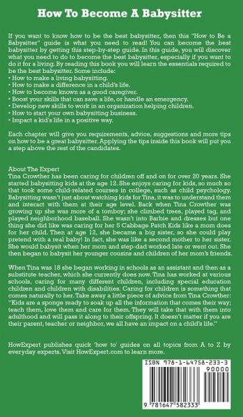 If you want to know how to be the best babysitter, then this "How to Be a Babysitter" guide is what you need to read! You can become the best babysitter by getting this step-by-step guide. In this guide, you will discover what you need to do to become the best babysitter, especially if you want to do it for a living. By reading this book you will learn the essentials required to be the best babysitter. Some include: - How to make a living babysitting. - How to make a difference in a child's life. - How to become known as a good caregiver. - Boost your skills that can save a life, or handle an emergency. - Develop new skills to work in an organization helping children. - How to start your own babysitting business. - Impact a kid's life in a positive way. Each chapter will give you requirements, advice, suggestions and more tips on how to be a great babysitter. Applying the tips inside this book will put you a step above the rest of the candidates. About The Expert Tina Crowther has been caring for children off and on for over 20 years. She started babysitting kids at the age 12. She enjoys caring for kids, so much so that took some child-related courses in college, such as child psychology. Babysitting wasn't just about watching kids for Tina, it was to understand them and interact with them at their age level. Back when Tina Crowther was growing up she was more of a tomboy; she climbed trees, played tag, and played neighborhood baseball. She wasn't into Barbie and dresses but one thing she did like was caring for her 5 Cabbage Patch Kids like a mom does for her child. Then at age 12, she became a big sister, so she could play pretend with a real baby! In fact, she was like a second mother to her sister. She would babysit when her mom and step-dad worked late or went out. She then began to babysit her younger cousins and children of her mom's friends. When Tina was 18 she began working in schools as an assistant and then as a substitute teacher, which she currently does now. Tina has worked at various schools, caring for many different children, including special education children and children with disabilities. Caring for children is something that comes naturally to her. Take away a little piece of advice from Tina Crowther: "Kids are a sponge ready to soak up all the information that comes their way; teach them, love them and care for them. They will take that with them into adulthood and will pass it along to their offspring. It doesn't matter if you are their parent, teacher or neighbor, we all have an impact on a child's life." HowExpert publishes quick 'how to' guides on all topics from A to Z by everyday experts.