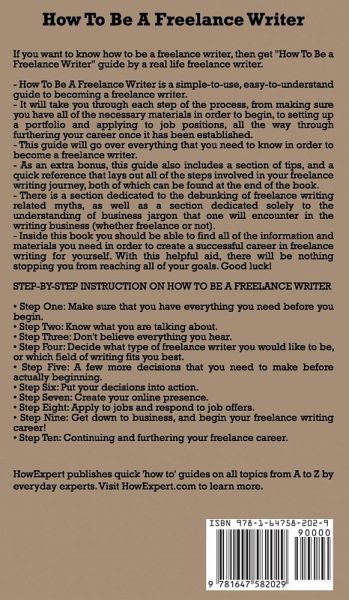 If you want to know how to be a freelance writer, then get "How To Be a Freelance Writer" guide by a real life freelance writer. - How To Be A Freelance Writer is a simple-to-use, easy-to-understand guide to becoming a freelance writer. - It will take you through each step of the process, from making sure you have all of the necessary materials in order to begin, to setting up a portfolio and applying to job positions, all the way through furthering your career once it has been established. - This guide will go over everything that you need to know in order to become a freelance writer. - As an extra bonus, this guide also includes a section of tips, and a quick reference that lays out all of the steps involved in your freelance writing journey, both of which can be found at the end of the book. - There is a section dedicated to the debunking of freelance writing related myths, as well as a section dedicated solely to the understanding of business jargon that one will encounter in the writing business (whether freelance or not). - Inside this book you should be able to find all of the information and materials you need in order to create a successful career in freelance writing for yourself. With this helpful aid, there will be nothing stopping you from reaching all of your goals. Good luck! STEP-BY-STEP INSTRUCTION ON HOW TO BE a FREELANCE WRITER • Step One: Make sure that you have everything you need before you begin. • Step Two: Know what you are talking about. • Step Three: Don't believe everything you hear. • Step Four: Decide what type of freelance writer you would like to be, or which field of writing fits you best. • Step Five: A few more decisions that you need to make before actually beginning. • Step Six: Put your decisions into action. • Step Seven: Create your online presence. • Step Eight: Apply to jobs and respond to job offers. • Step Nine: Get down to business, and begin your freelance writing career! • Step Ten: Continuing and furthering your freelance career. About The Expert Chelsea Hammond has been a freelancer for roughly five years. She has worked primarily through the Upwork application when working for clients. She has done work in all fields of freelance writing, except for translation writing. The fields that she has the most experience in are blog writing, article writing, and content writing. On her own, she has also published one full-length novel ('A Severing of Ties'), and two books of poetry ('The Eloquence of A Child,' and 'A Rose Amongst Thorns'). HowExpert publishes quick 'how to' guides on all topics from A to Z by everyday experts.