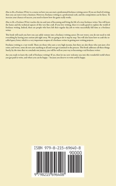 How to Be a Freelance Writer is a course on how you can start a professional freelance writing career. If you are fond of writing, then you can turn it into a business. However, freelance writing is a professional craft, and the competition can be fierce. To increase your chances of success, you need to know how the game really works. How to Be a Freelance Writer teaches the ins and outs of becoming and living the life of a true freelance writer. You will learn the basics and the technical aspects of this very fine craft. If you love writing, then it is really good to explore the world of freelance writing. Indeed, there are people who have left their regular day job to write successfully full time as a freelance writer. This book will teach you how you can safely venture into a freelance writing career. Do not worry; you do not need to risk everything by leaving your current job right away. We are going to do it step by step. You will also learn how to craft the so-called query letter, which is a very important weapon of a freelance writer in getting new writing projects. Freelance writing is a vast world. There are those who earn a very high income, but there are also those who earn just a few coins; and worse, some do not earn anything at all and even get scammed in the process. This book addresses all these things. Surely, by the time that we conclude our journey, you will be well on your way to becoming a real freelance writer. Are you ready to learn the craft of freelance writing? If yes, then let me now welcome you into this wonderful world where you get paid to write, and where you can be happy -- because you deserve to write and be happy.