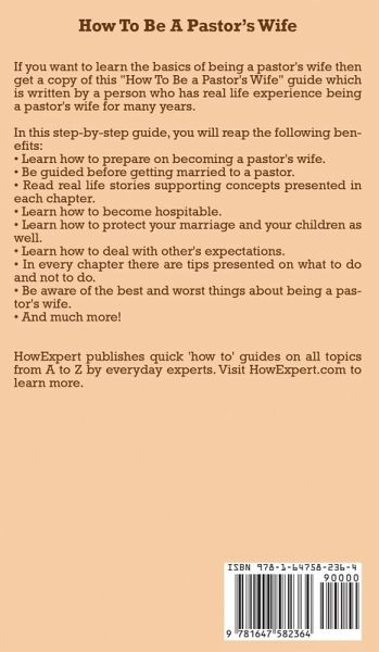 If you want to learn the basics of being a pastor's wife then listen to this guide, which is written by a person who has real-life experience being a pastor's wife for many years. In this step-by-step guide, you will reap the following benefits: Learn how to prepare on becoming a pastor's wife Be guided before getting married to a pastor Read real life stories supporting concepts presented in each chapter Learn how to become hospitable Learn how to protect your marriage and your children as well Learn how to deal with others' expectations In every chapter there are tips presented on what to do and not to do Be aware of the best and worst things about being a pastor's wife And much more! HowExpert publishes quick 'how to' guides on all topics from A to Z by everyday experts.