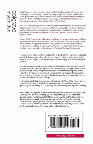 'Mark Vernon - a former Anglican priest who left the church only to find dogmatic unbelief just as unsatisfying - shows how being an agnostic can be a modern version of the spiritual life. If you are discontented with simple-minded atheism and literal-minded faith, this is the book for you.'- John Gray, author of The Immortalization Commisssion: Science and the Strange Quest to Cheat Death