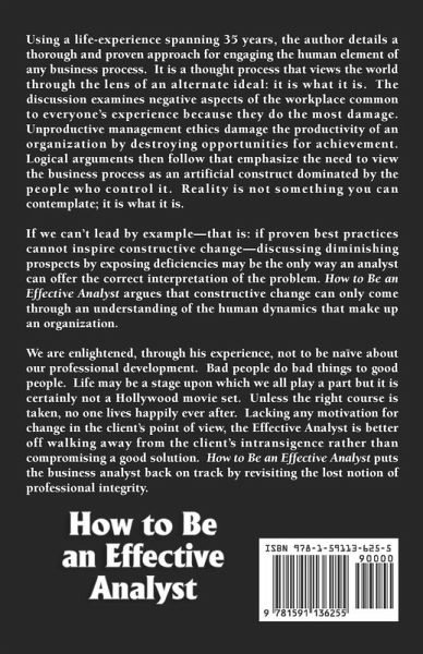 How to Be an Effective Analyst is a book that guides the reader through a discussion of the personal approach an analyst should use in any engagement. It focuses on the importance of understanding the need for professional integrity.