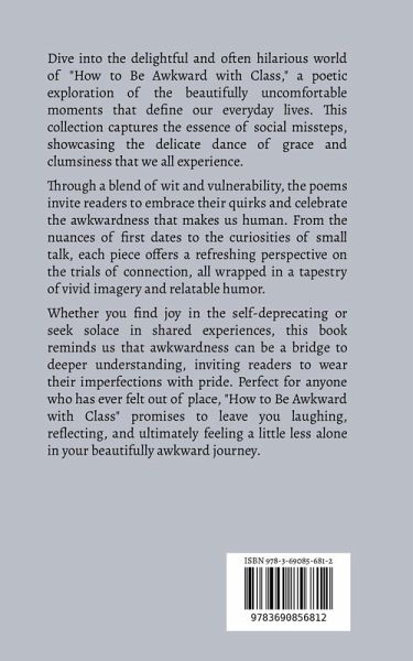 Dive into the delightful and often hilarious world of "How to Be Awkward with Class," a poetic exploration of the beautifully uncomfortable moments that define our everyday lives. This collection captures the essence of social missteps, showcasing the delicate dance of grace and clumsiness that we all experience. Through a blend of wit and vulnerability, the poems invite readers to embrace their quirks and celebrate the awkwardness that makes us human. From the nuances of first dates to the curiosities of small talk, each piece offers a refreshing perspective on the trials of connection, all wrapped in a tapestry of vivid imagery and relatable humor. Whether you find joy in the self-deprecating or seek solace in shared experiences, this book reminds us that awkwardness can be a bridge to deeper understanding, inviting readers to wear their imperfections with pride. Perfect for anyone who has ever felt out of place, "How to Be Awkward with Class" promises to leave you laughing, reflecting, and ultimately feeling a little less alone in your beautifully awkward journey.