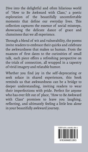 Dive into the delightful and often hilarious world of "How to Be Awkward with Class," a poetic exploration of the beautifully uncomfortable moments that define our everyday lives. This collection captures the essence of social missteps, showcasing the delicate dance of grace and clumsiness that we all experience. Through a blend of wit and vulnerability, the poems invite readers to embrace their quirks and celebrate the awkwardness that makes us human. From the nuances of first dates to the curiosities of small talk, each piece offers a refreshing perspective on the trials of connection, all wrapped in a tapestry of vivid imagery and relatable humor. Whether you find joy in the self-deprecating or seek solace in shared experiences, this book reminds us that awkwardness can be a bridge to deeper understanding, inviting readers to wear their imperfections with pride. Perfect for anyone who has ever felt out of place, "How to Be Awkward with Class" promises to leave you laughing, reflecting, and ultimately feeling a little less alone in your beautifully awkward journey.