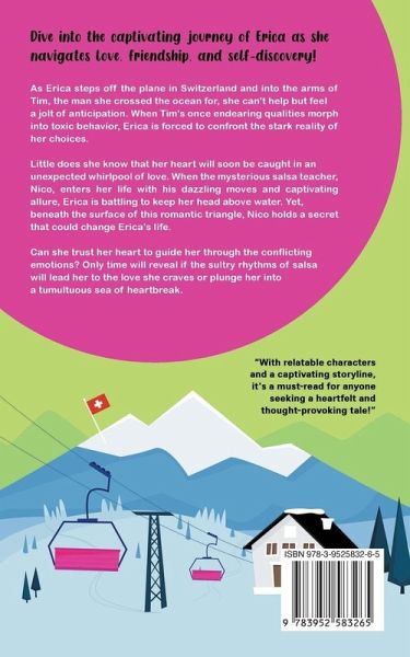 As Erica steps off the plane in Switzerland and into the arms of Tim, the man she crossed the ocean for, she can't help but feel a jolt of anticipation. When Tim's once endearing qualities morph into toxic behavior, Erica is forced to confront the stark reality of her choices. Little does she know that her heart will soon be caught in an unexpected whirlpool of love. When the mysterious salsa teacher, Nico, enters her life with his dazzling moves and captivating allure, Erica is battling to keep her head above water. Yet, beneath the surface of this romantic triangle, Nico holds a secret that could change Erica's life. Can she trust her heart to guide her through the conflicting emotions? Only time will reveal if the sultry rhythms of salsa will lead her to the love she craves or plunge her into a tumultuous sea of heartbreak.