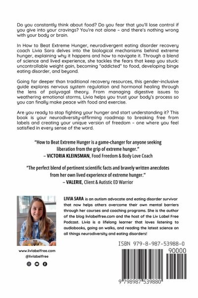 "A game-changer for anyone seeking liberation from the grip of extreme hunger." - Victoria Kleinsman, Food Freedom and Body Love Coach "An empathetic and practical guide for getting through this messy part of recovery." - Stefanie Michele, Binge Eating and Body Image Coach Do you constantly think about food? Do you fear that you'll lose control if you give into your cravings? You're not alone - and there's nothing wrong with your body or brain. In How to Beat Extreme Hunger, neurodivergent eating disorder recovery coach Livia Sara delves into the biological mechanisms behind extreme hunger, explaining why it happens and how to navigate it. Through a blend of science and lived experience, she tackles the fears that keep you stuck: uncontrollable weight gain, becoming "addicted" to food, developing binge eating disorder, and beyond. Going far deeper than traditional recovery resources, this gender-inclusive guide explores nervous system regulation and hormonal healing through the lens of polyvagal theory. From managing digestive issues to weathering emotional storms, Livia helps you trust your body's process so you can finally make peace with food and exercise. Are you ready to stop fighting your hunger and start understanding it? Grab your copy of How to Beat Extreme Hunger, your neurodiversity-affirming roadmap to breaking free from labels and creating your unique version of freedom - one where you feel satisfied in every sense of the word.