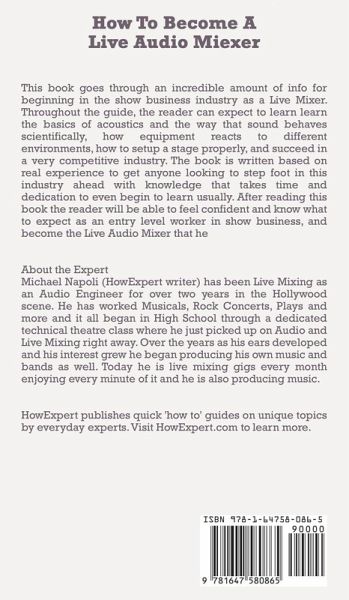 This book goes through an incredible amount of info for beginning in the show business industry as a Live Mixer. Throughout the guide, the reader can expect to learn learn the basics of acoustics and the way that sound behaves scientifically, how equipment reacts to different environments, how to setup a stage properly, and succeed in a very competitive industry. The book is written based on real experience to get anyone looking to step foot in this industry ahead with knowledge that takes time and dedication to even begin to learn usually. After reading this book the reader will be able to feel confident and know what to expect as an entry level worker in show business, and become the Live Audio Mixer that he About the Expert Michael Napoli (HowExpert writer) has been Live Mixing as an Audio Engineer for over two years in the Hollywood scene. He has worked Musicals, Rock Concerts, Plays and more and it all began in High School through a dedicated technical theatre class where he just picked up on Audio and Live Mixing right away. Over the years as his ears developed and his interest grew he began producing his own music and bands as well. Today he is live mixing gigs every month enjoying every minute of it and he is also producing music. HowExpert publishes quick 'how to' guides on all topics from A to Z by everyday experts.