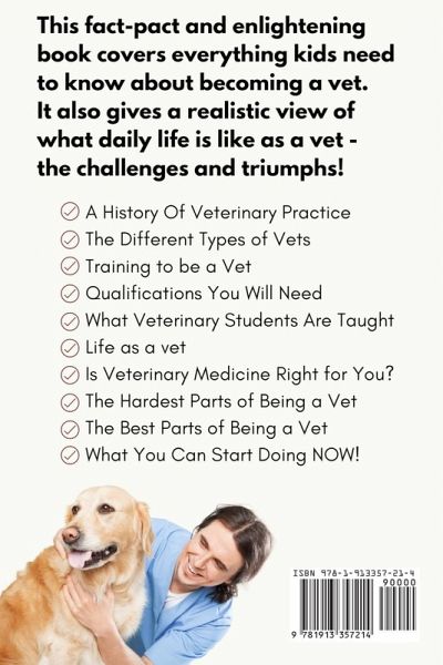 The Most Up-to-Date, Comprehensive and Fun Guide to Becoming a Vet - Over 100 pages This fact-pact and enlightening book covers everything kids need to know about becoming a vet. It also gives a realistic view of what daily life is like as a vet - the challenges and triumphs. My name is Susanna Lee and recently my daughter Monica, who has a passion for animals, asked me to help her find information on becoming a vet. Surprisingly, I couldn’t find a book that contains up-to-date information and gives a real insight into what it takes to become a vet. Most importantly, I wanted my daughter to be able to decide for herself if veterinary medicine was truly the career for her based on getting the most rounded picture possible - the good, the bad and everything in between. So being a journalist and writer for over 20 years, I took up the challenge to create that missing book! In How to Become a Veterinarian, I share the latest practical information available, but also offer a human perspective on life as a vet and what it’s really like to work towards that goal. This book covers: ¿ A History Of Veterinary Practice ¿ The Different Types of Vets ¿ Training to be a Vet ¿ Qualifications You Will Need ¿ What Veterinary Students Are Taught ¿ Life as a vet ¿ Is Veterinary Medicine the Right Career for You? ¿ The Hardest Parts of Being a Vet ¿ The Best Parts of Being a Vet ¿ What You Can Start Doing NOW ¿ Veterinary Assistants ¿ Veterinary Technicians ¿ Myths and Fun Facts About Veterinary Medicine ¿ Pioneering Veterinarians ¿ Best Colleges for Veterinary Medicine