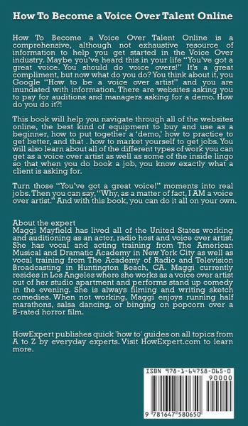How To Become a Voice Over Talent Online is a comprehensive, although not exhaustive resource of information to help you get started in the Voice Over industry. Maybe you’ve heard this in your life "You’ve got a great voice. You should do voice overs!" It’s a great compliment, but now what do you do? You think about it, you Google "How to be a voice over artist" and you are inundated with information. There are websites asking you to pay for auditions and managers asking for a demo. How do you do it?! This book will help you navigate through all of the websites online, the best kind of equipment to buy and use as a beginner, how to put together a ‘demo,’ how to practice to get better, and that . how to market yourself to get jobs. You will also learn about all of the different types of work you can get as a voice over artist as well as some of the inside lingo so that when you do book a job, you know exactly what a client is asking for. Turn those "You’ve got a great voice!" moments into real jobs. Then you can say, "Why, as a matter of fact, I AM a voice over artist." And with this book, you can do it all on your own. About the Expert Maggi Mayfield has lived all of the United States working and auditioning as an actor, radio host and voice over artist. She has vocal and acting training from The American Musical and Dramatic Academy in New York City as well as vocal training from The Academy of Radio and Television Broadcasting in Huntington Beach, CA. Maggi currently resides in Los Angeles where she works as a voice over artist out of her studio apartment and performs stand up comedy in the evening. She is always filming and writing sketch comedies. When not working, Maggi enjoys running half marathons, salsa dancing, or binging on popcorn over a B-rated horror film. HowExpert publishes quick 'how to' guides on all topics from A to Z by everyday experts.