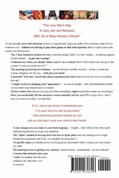 Dubbed "The lazy man's way to easy sex and romance with 20 or more women a month," How to Become an Alpha Male is the no-risk, never-fail blueprint on how to 'magnetically' attract an endless flow of horny, ready-for-sex women to you... without ever having to play their games or deal with rejection. Sold as an ebook at AlphaMaleSystem.com, John Alexander's guide is now available, for the first time ever, as a hardcopy book. You see, once you have these secrets all the 'work' of meeting women will be done for you... automatically! You can just 'flip on' your magnetic powers of attraction... so to speak... and instantly bring sex, romance and more roaring into your life! Why does the Alpha Male Method work so well? Because it's based on the same hush-hush psychological tactics advertisers have used for centuries to get filthy rich. They work for anyone, anywhere and at any time (no matter how desperate your situation is right now).