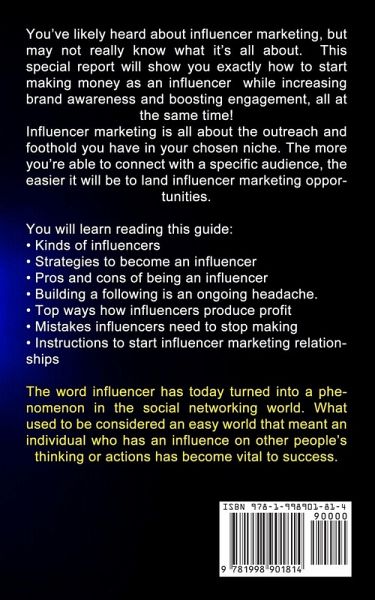 You've likely heard about influencer marketing, but may not really know what it's all about. This special report will show you exactly how to start making money as an influencer while increasing brand awareness and boosting engagement, all at the same time! Influencer marketing is all about the outreach and foothold you have in your chosen niche. The more you're able to connect with a specific audience, the easier it will be to land influencer marketing opportunities. You will learn reading this guide:Kinds of influencers Strategies to become an influencer Pros and cons of being an influencer Building a following is an ongoing headache. Top ways how influencers produce profit Mistakes influencers need to stop making Instructions to start influencer marketing relationships The word influencer has today turned into a phenomenon in the social networking world. What used to be considered an easy world that meant an individual who has an influence on other people's thinking or actions has become vital to success.