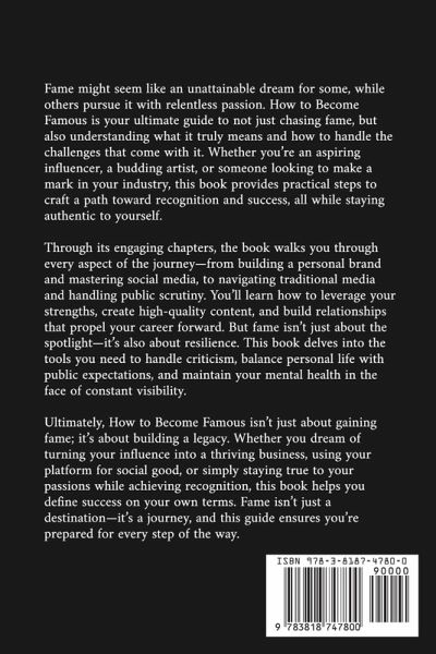Fame might seem like an unattainable dream for some, while others pursue it with relentless passion. How to Become Famous is your ultimate guide to not just chasing fame, but also understanding what it truly means and how to handle the challenges that come with it. Whether you're an aspiring influencer, a budding artist, or someone looking to make a mark in your industry, this book provides practical steps to craft a path toward recognition and success, all while staying authentic to yourself.Through its engaging chapters, the book walks you through every aspect of the journey-from building a personal brand and mastering social media, to navigating traditional media and handling public scrutiny. You'll learn how to leverage your strengths, create high-quality content, and build relationships that propel your career forward. But fame isn't just about the spotlight-it's also about resilience. This book delves into the tools you need to handle criticism, balance personal life with public expectations, and maintain your mental health in the face of constant visibility.Ultimately, How to Become Famous isn't just about gaining fame; it's about building a legacy. Whether you dream of turning your influence into a thriving business, using your platform for social good, or simply staying true to your passions while achieving recognition, this book helps you define success on your own terms. Fame isn't just a destination-it's a journey, and this guide ensures you're prepared for every step of the way.