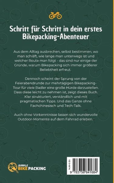 Aus dem Alltag ausbrechen, selbst bestimmen, wo man schläft, wie lange man unterwegs ist und welcher Route man folgt - das sind nur einige Gründe, warum sich Bikepacking immer größerer Beliebtheit erfreut.Dennoch scheint der Sprung von der Feierabendrunde zur mehrtägigen Bikepacking-Tour für viele Radler eine große Hürde darzustellen. Dass diese leicht zu nehmen ist, zeigt dieses Buch. Klar strukturiert, verständlich und mit pragmatischen Tipps. Und das Ganze ohne Fachchinesisch und Tech-Talk.