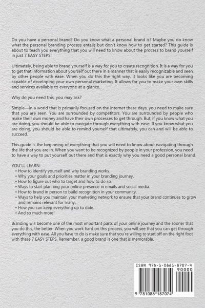 Do you have a personal brand? Do you know what a personal brand is? Maybe you do know what the personal branding process entails but don't know how to get started? This guide is about to teach you everything that you will need to know about the process to brand yourself in just 7 EASY STEPS! Ultimately, being able to brand yourself is a way for you to create recognition. It is a way for you to get that information about yourself out there in a manner that is easily recognizable and seen by other people with ease. When you do this the right way, it looks like you are becoming capable of developing your own personal marketing. It allows for you to make your own skills and services available to everyone at a glance. Why do you need this, you may ask? Simple-in a world that is primarily focused on the internet these days, you need to make sure that you are seen. You are surrounded by competitors. You are surrounded by people who make their own money and have their own processes to get through. But, if you know what you are doing, you should be able to navigate through everything with ease. If you know what you are doing, you should be able to remind yourself that ultimately, you can and will be able to succeed. This guide is the beginning of everything that you will need to know about navigating through the life that you are in. When you want to be recognized by people in your profession, you need to have a way to put yourself out there and that is exactly why you need a good personal brand. YOU'LL LEARN: · How to identify yourself and why branding works. · Why your goals and priorities matter in your branding journey. · How to figure out who to target and how to do so. · Ways to start planning your online presence in emails and social media. · How to brand in person to build recognition in your community. · Ways to help you maintain your marketing network to ensure that your brand continues to grow and remains relevant for many. · How you can keep everything up to date. · And so much more! Branding will become one of the most important parts of your online journey and the sooner that you do this, the better. When you work hard on this process, you will see that you can get through everything with ease. All you have to do is make sure that you're willing to start off on the right foot with these 7 EASY STEPS. Remember, a good brand is one that is memorable. Let's get started!