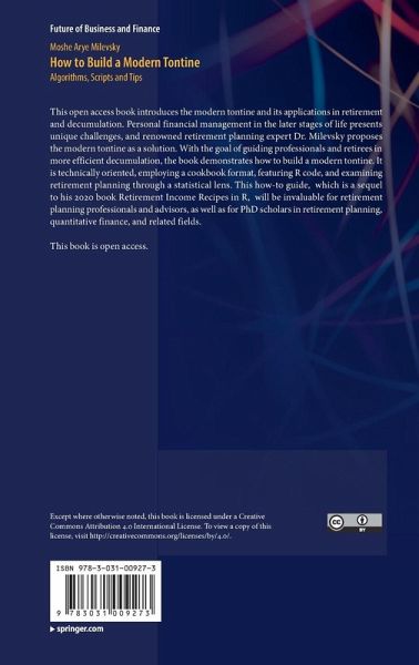This open access book introduces the modern tontine and its applications in retirement and decumulation. Personal financial management in the later stages of life presents unique challenges, and renowned retirement planning expert Dr. Milevsky proposes the modern tontine as a solution. With the goal of guiding professionals and retirees in more efficient decumulation, the book demonstrates how to build a modern tontine. It is technically oriented, employing a cookbook format, featuring R code, and examining retirement planning through a statistical lens. This how-to guide, which is a sequel to…mehr