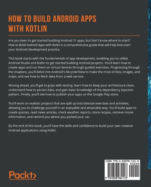 Are you keen to get started building Android 11 apps, but don't know where to start? How to Build Android Apps with Kotlin is a comprehensive guide that will help kick-start your Android development practice. This book starts with the fundamentals of app development, enabling you to utilize Android Studio and Kotlin to get started building Android projects. You'll learn how to create apps and run them on virtual devices through guided exercises. Progressing through the chapters, you'll delve into Android's RecyclerView to make the most of lists, images, and maps, and see how to fetch data from a web service. Moving ahead, you'll get to grips with testing, learn how to keep your architecture clean, understand how to persist data, and gain basic knowledge of the dependency injection pattern. Finally, you'll see how to publish your apps on the Google Play store. You'll work on realistic projects that are split up into bitesize exercises and activities, allowing you to challenge yourself in an enjoyable and attainable way. You'll build apps to create quizzes, read news articles, check weather reports, store recipes, retrieve movie information, and remind you where you parked your car. By the end of this book, you'll have the skills and confidence to build your own creative Android applications using Kotlin.